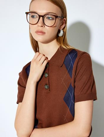 Koton X Melis Ağazat - Kısa Kollu Baklava Desenli Taşlı Düğme Detaylı Polo Yaka Triko Kazak