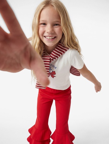 Kız çocukları için özenle hazırlanan 23 Nisan çocuk kıyafetleri tasarımlarında kırmızı ve beyaz tonlar ön plana çıkıyor. Kırmızı Atatürk baskılı tişört modelleri, mini şort etekler ve taytlarla kombinlendiğinde enerjik ve canlı bir görünüme kavuşuyor. Kız çocukları bayram coşkusunu doyasıya yaşarken, 23 Nisan çocuk kıyafetleri miniklere konfor sağlıyor.