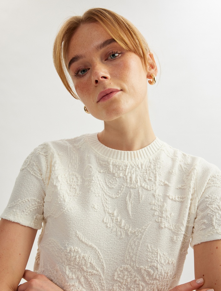 Pamuklu Kısa Kollu Bisiklet Yaka Floral Dokulu Crop Tişört