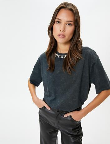 Parlak Taşlı Tişört Soluk Efektli Regular Fit Sepete Ekle