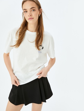 Kısa Kollu Bisiklet Yaka Nakışlı Oversize Tişört