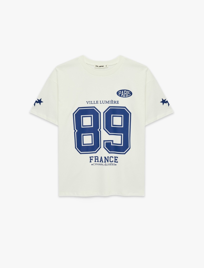 Rahat Kalıp Kısa Kollu Bisiklet Yaka Baskılı Tişört Sepete Ekle