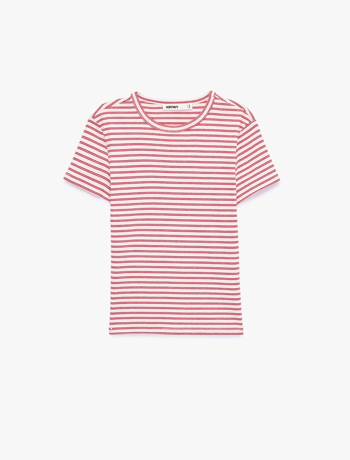 { "id": "8684848885313", "name": "Pamuklu Kısa Kollu Bisiklet Yaka Çizgili Tişört", "taxonomy":["CITY FASHION","CITY FASHION","WOMEN","JERSEY","TSHIRT SS"], "currency": "TRY", "unit_price": 599.99 , "unit_sale_price": 599.99 , "url": "https://www.koton.com/pamuklu-kisa-kollu-bisiklet-yaka-cizgili-tisort-kirmizi-cizgili-4154564-1/", "stock": 188, "color": "KIRMIZI ÇİZGİLİ", "size": "L", "product_image_url": "https://ktnimg2.mncdn.com/products/2026/04/07/3224534/9a768305-1245-409c-943d-ae967180e1d9_size870x1142.jpg" }