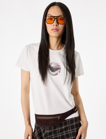 Regular Fit Bisiklet Yaka Kısa Kollu Simli Taşlı Baskılı Tişört