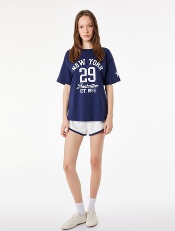 Rahat Kalıp Kısa Kollu Bisiklet Yaka Kolej Baskılı Tişört Sepete Ekle