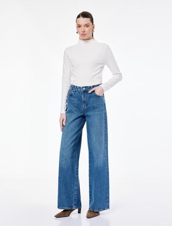 Normal Bel Pamuklu Düğmeli Cepli Geniş Paça Jean Pantolon - Wide Leg Jeans Sepete Ekle