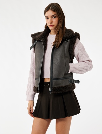 Dik Yaka Fermuarlı Cepli Peluş Detaylı Yelek Sepete Ekle