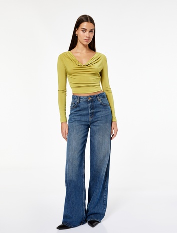 Madonna Yaka Omzu Açık Tişört Uzun Kollu Drapeli Slim Fit Viskon Karışımlı