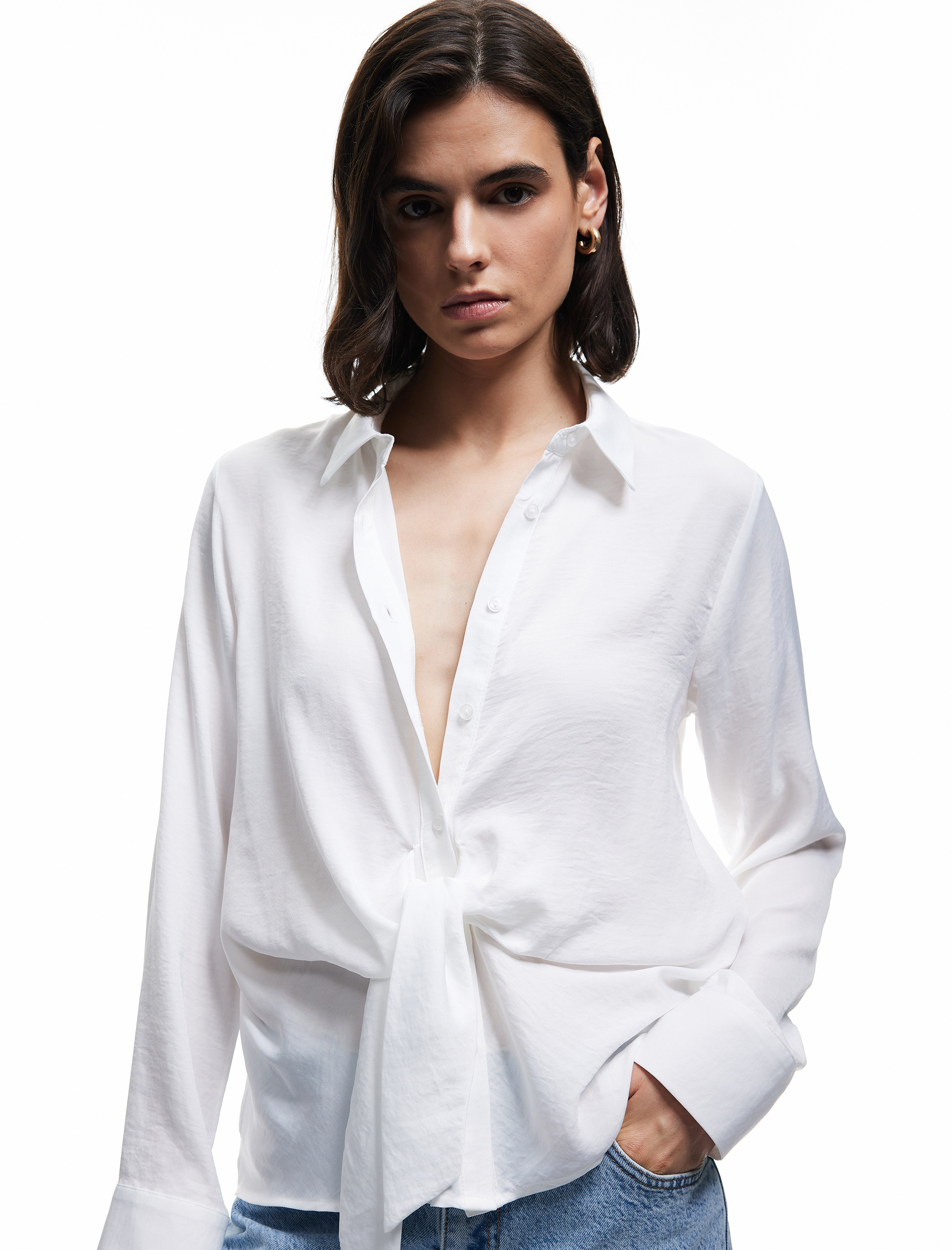 Aerobin Kumaş Uzun Kollu Önden Bağlama Detaylı Saten Gömlek