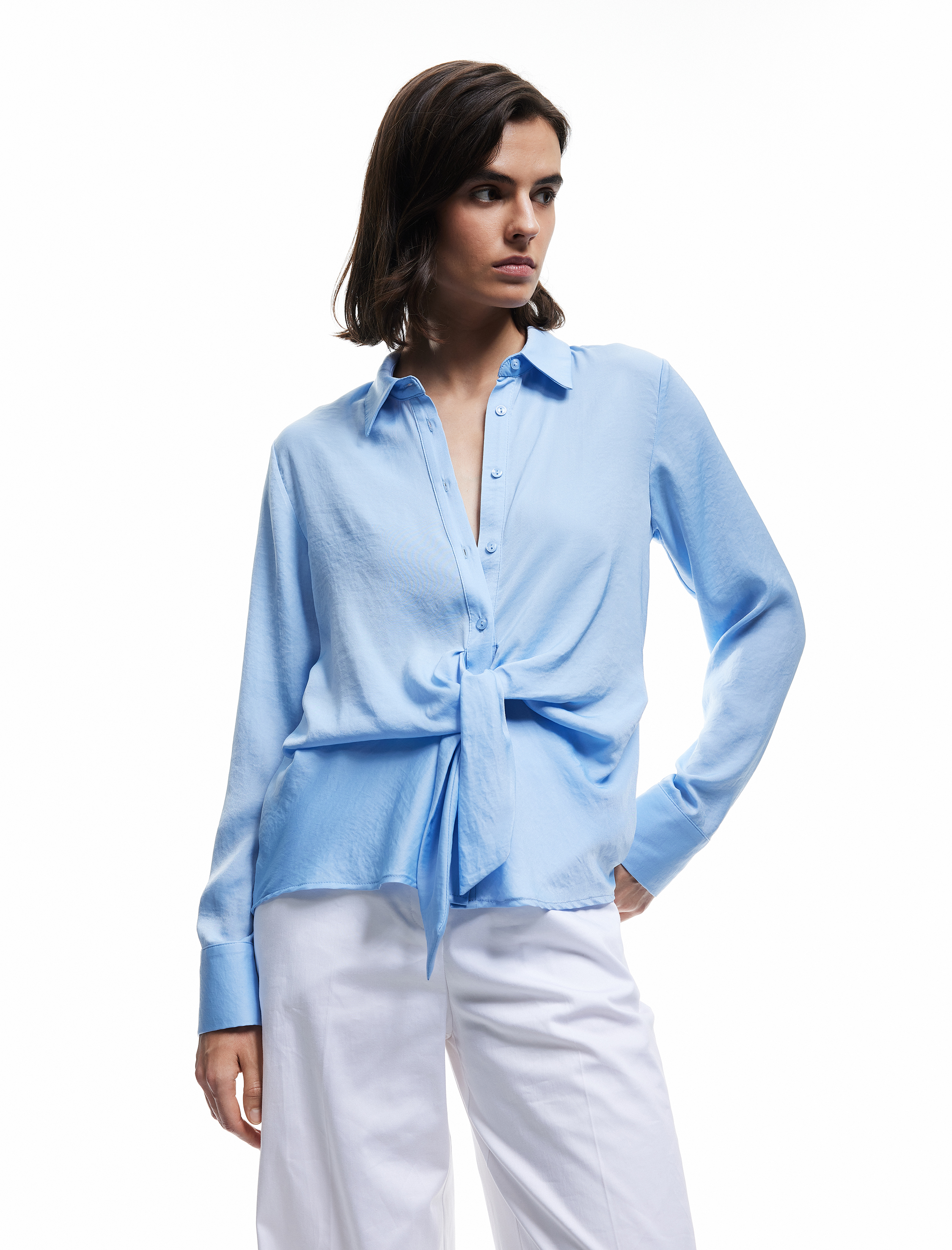 Aerobin Kumaş Uzun Kollu Önden Bağlama Detaylı Saten Gömlek
