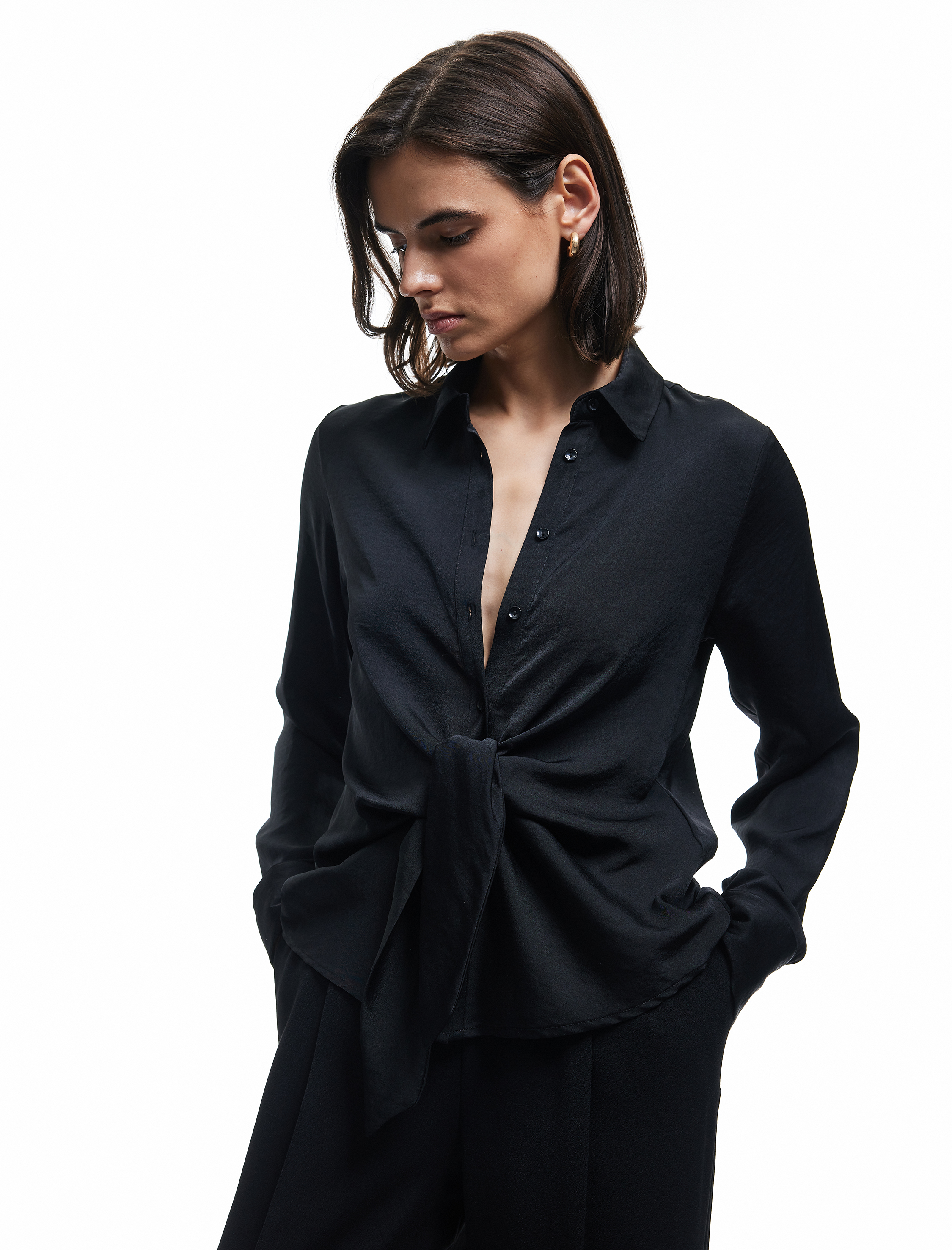 Aerobin Kumaş Uzun Kollu Önden Bağlama Detaylı Saten Gömlek