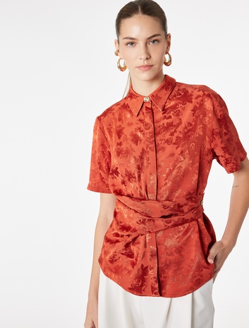 Viskon Kumaş Floral Dokulu Aksesuarlı Kısa Kollu Gömlek