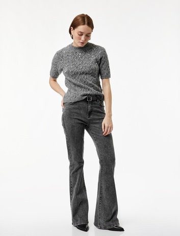 Bisiklet Yaka Kısa Kollu Taşlı Saç Örgü Kazak