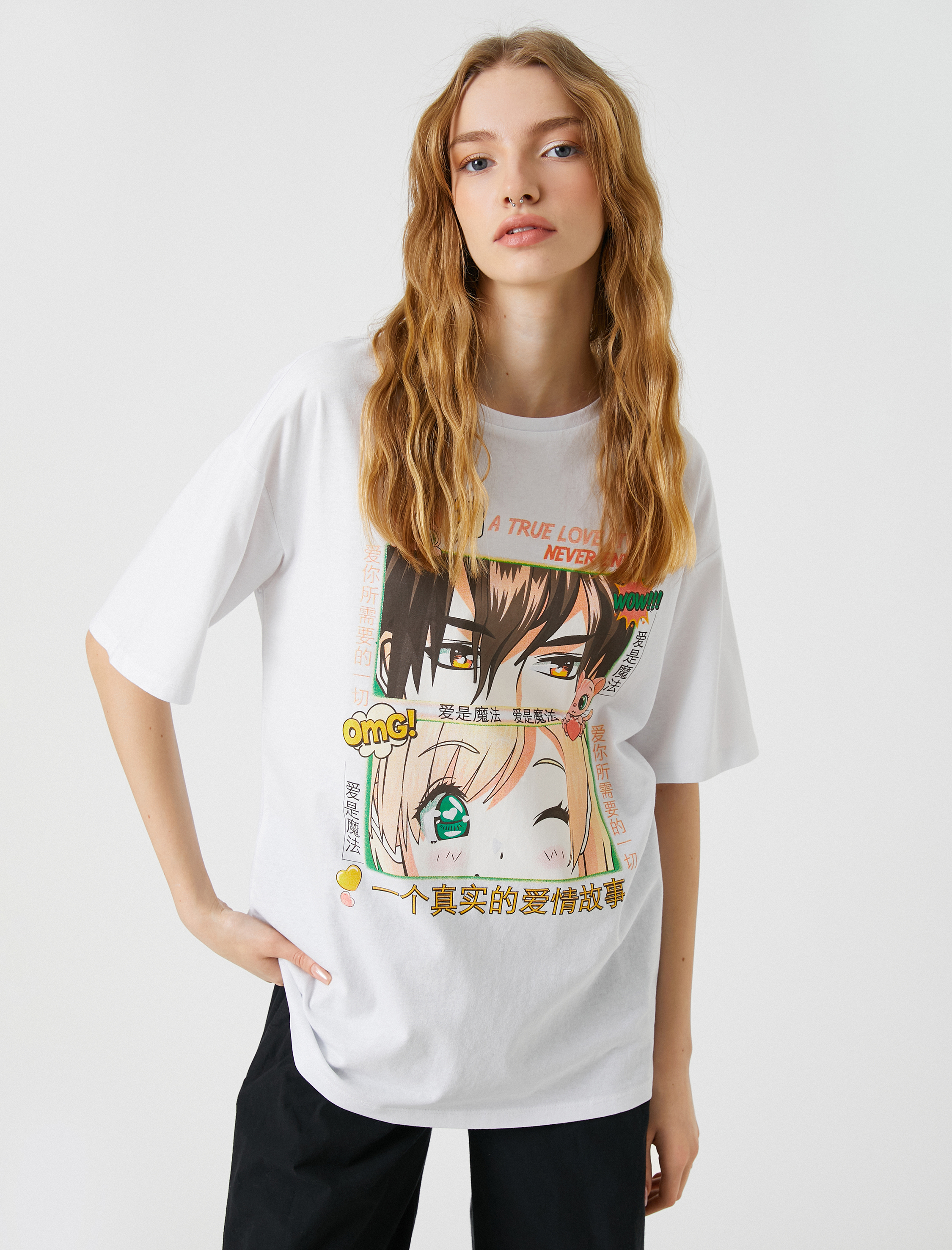 Anime Tişört Oversize Baskılı Kısa Kollu Bisiklet Yaka