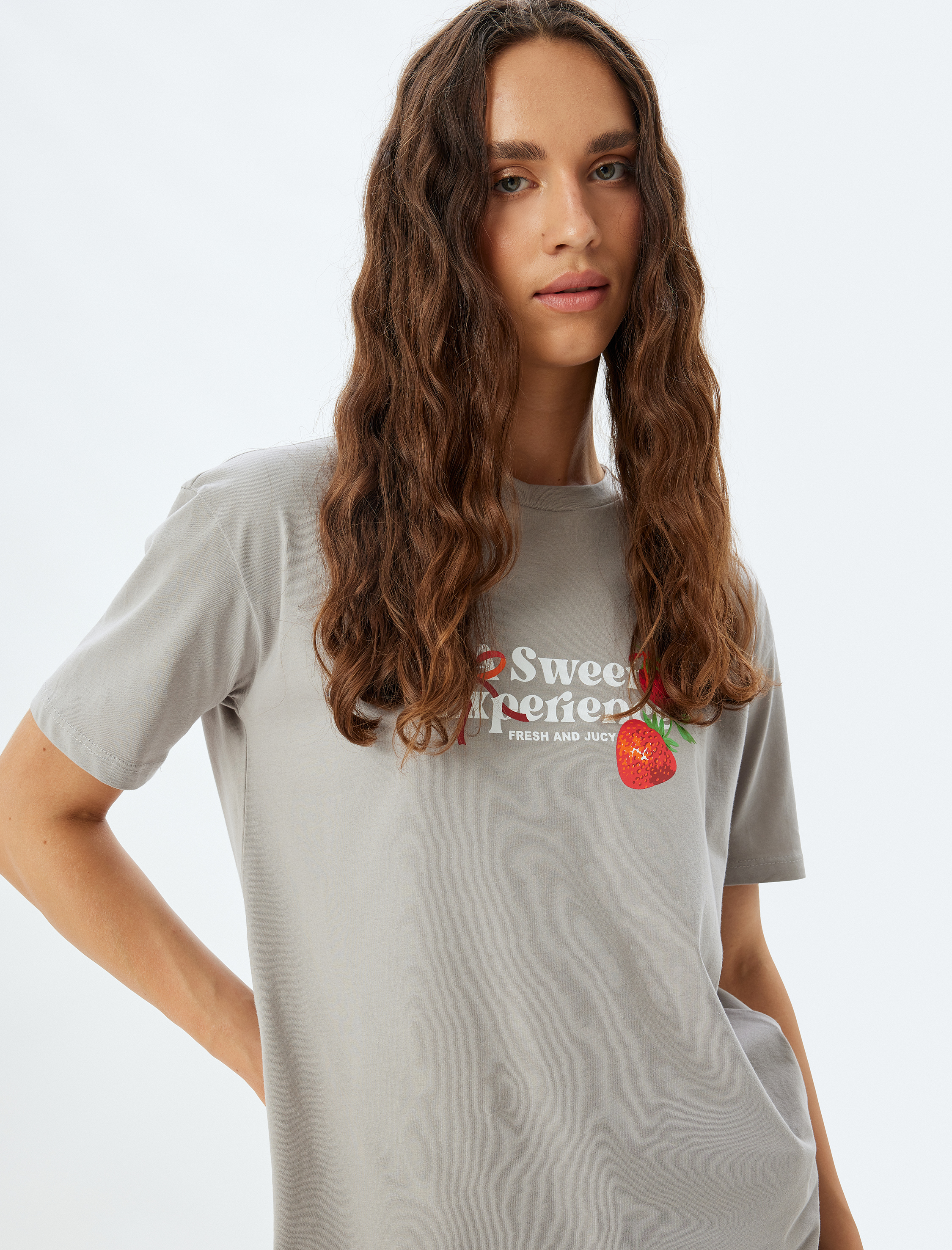 Arkası Meyve Baskılı Tişört Bisiklet Yaka Kısa Kollu Pamuklu