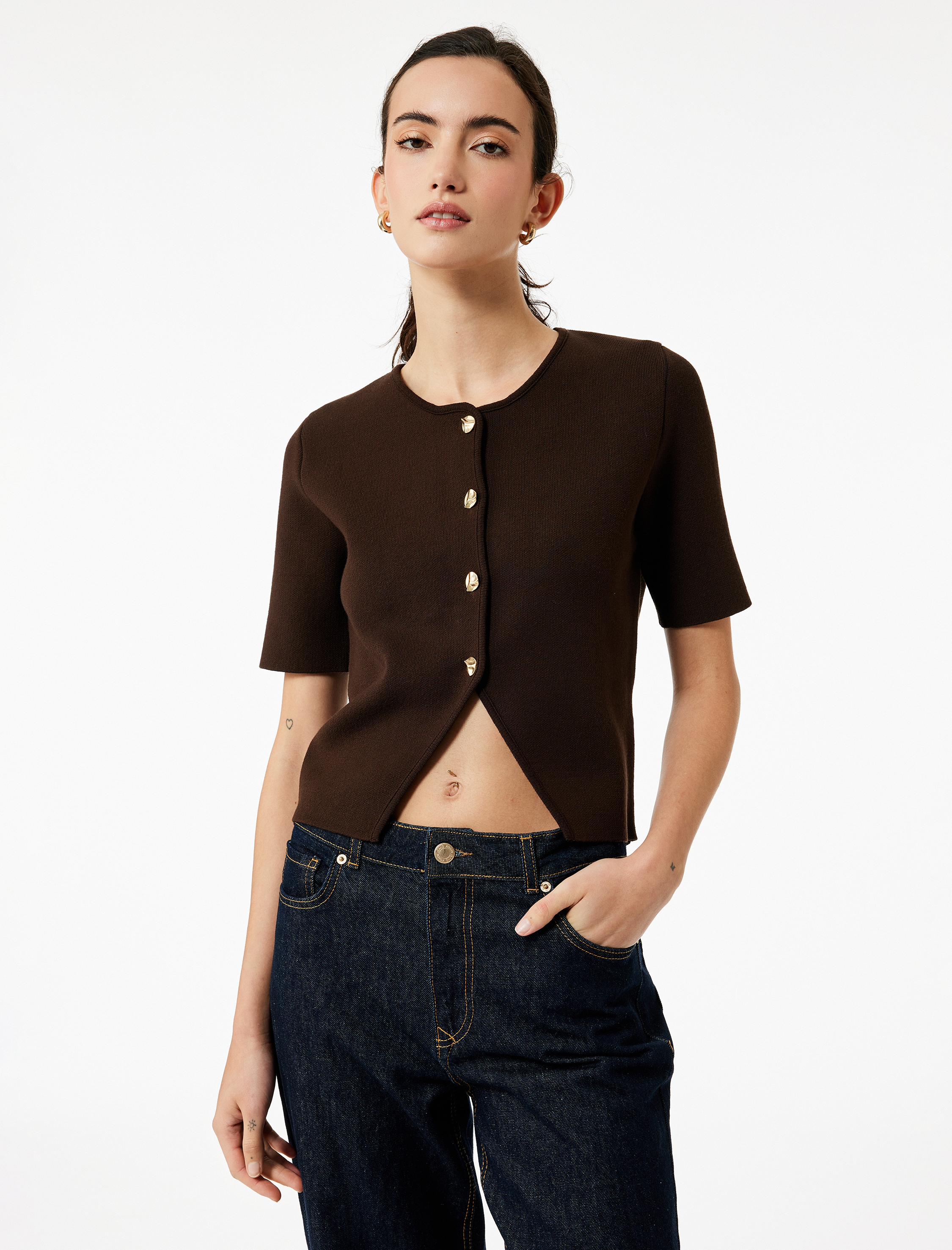 Asimetrik Kısa Kollu Bisiklet Yaka Düğmeli Hırka