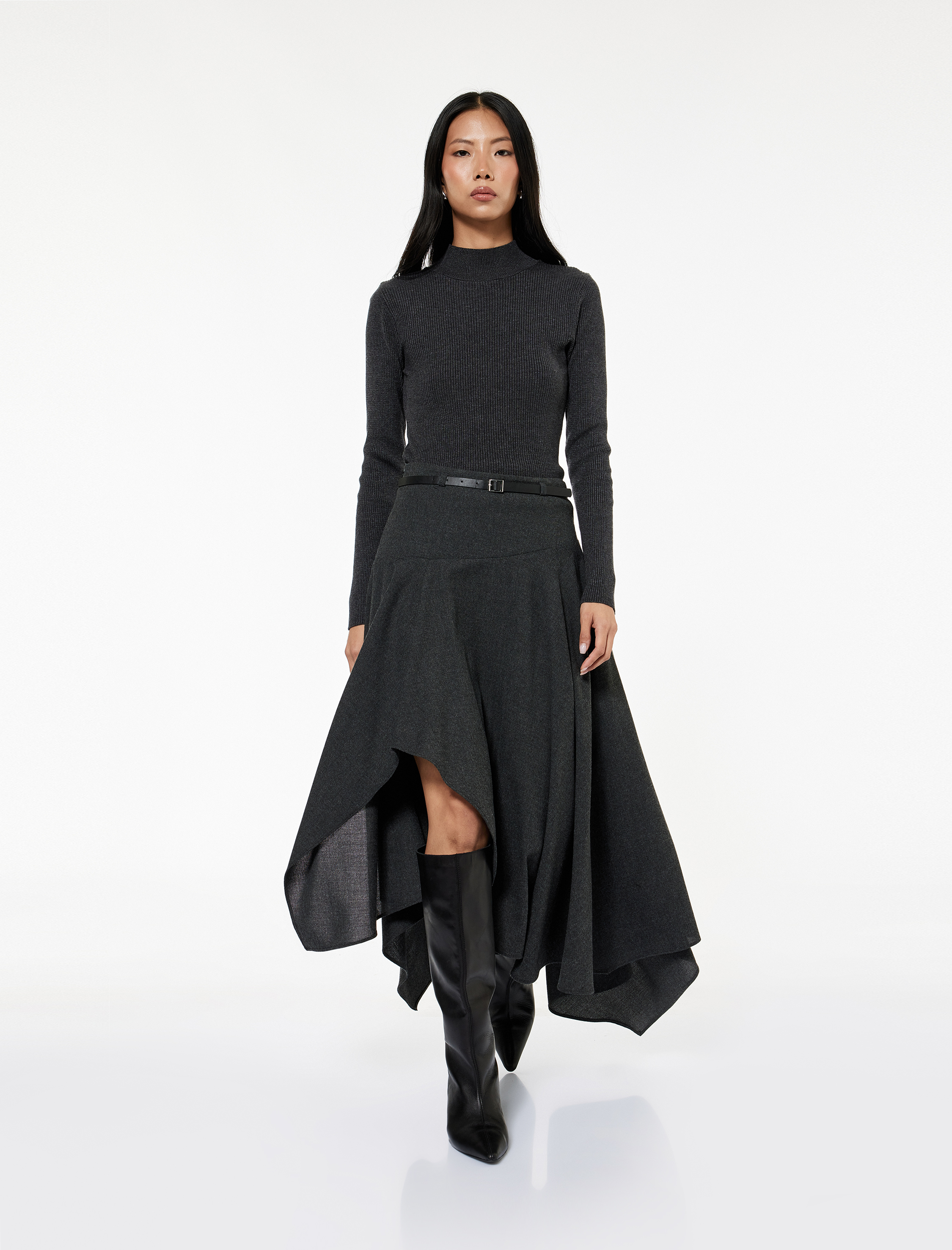 Asimetrik Uçlu Kemer Detaylı Volanlı Yün Karışımlı Kloş Midi Etek