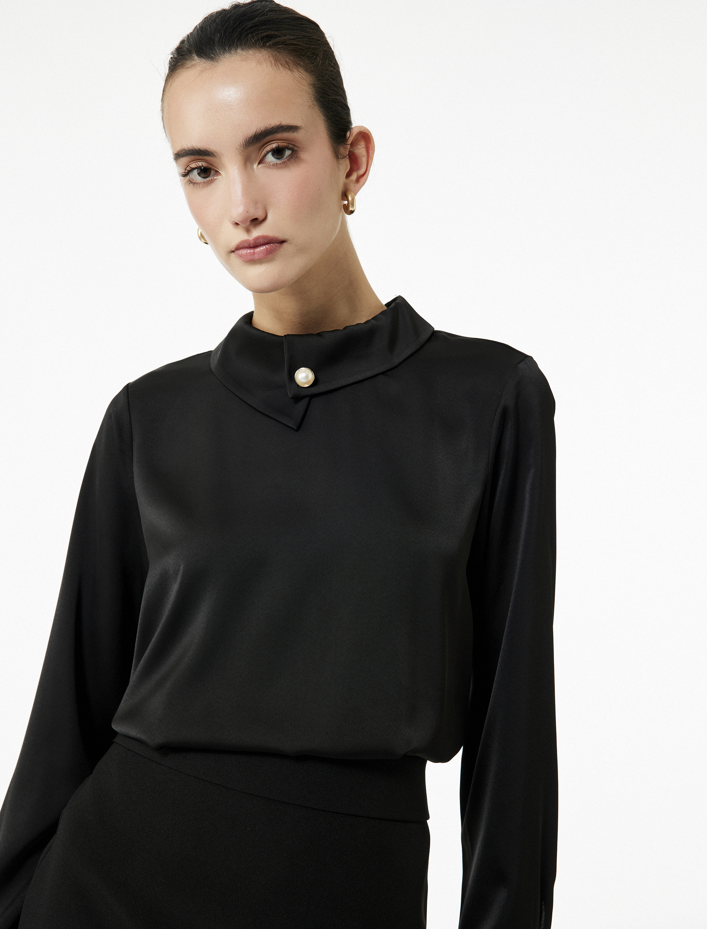 Asimetrik Yaka İnci Düğme Detaylı Uzun Kollu Saten Bluz