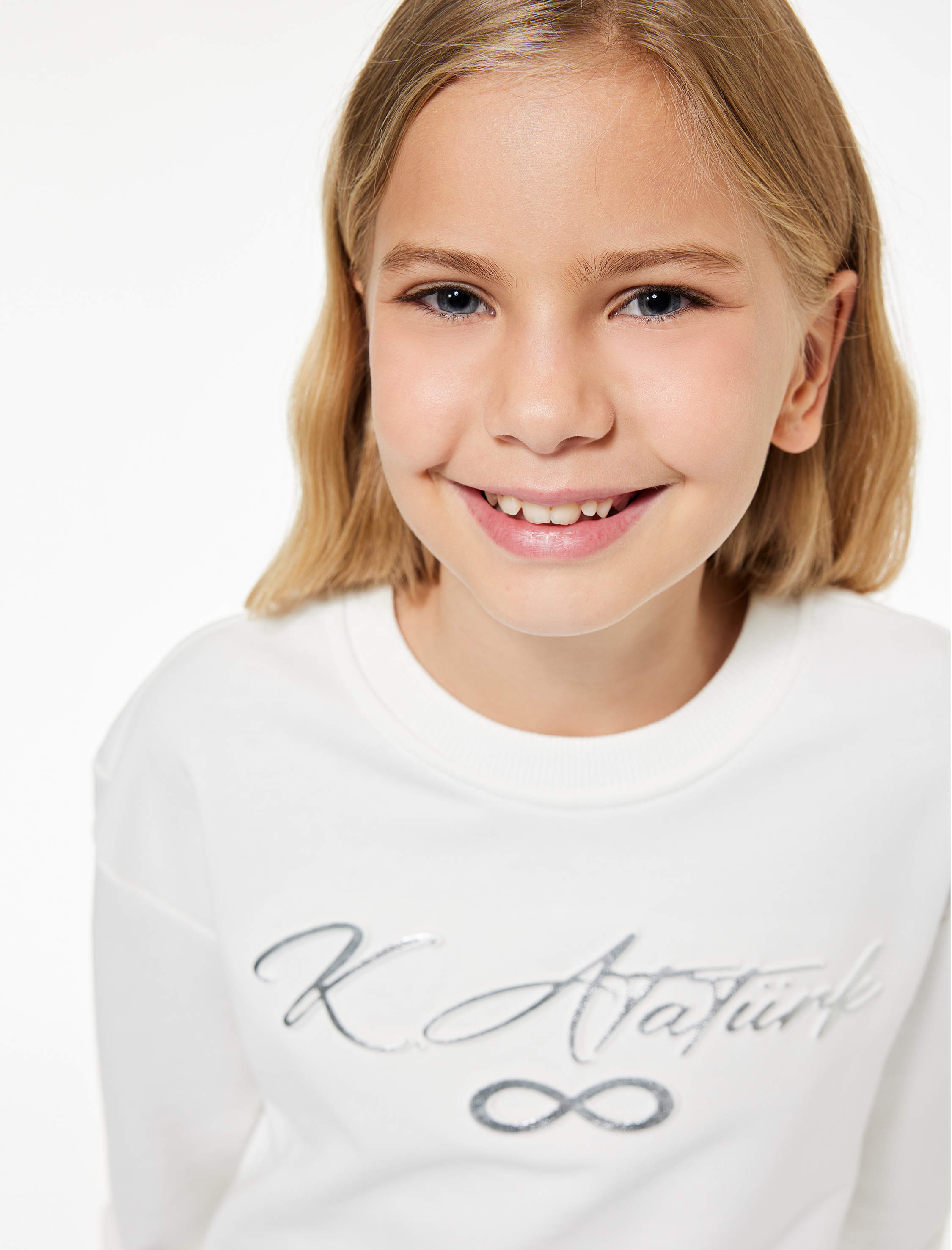 Kız Çocuk Atatürk Baskılı Uzun Kollu Bisiklet Yaka Şardonlu Sweatshirt