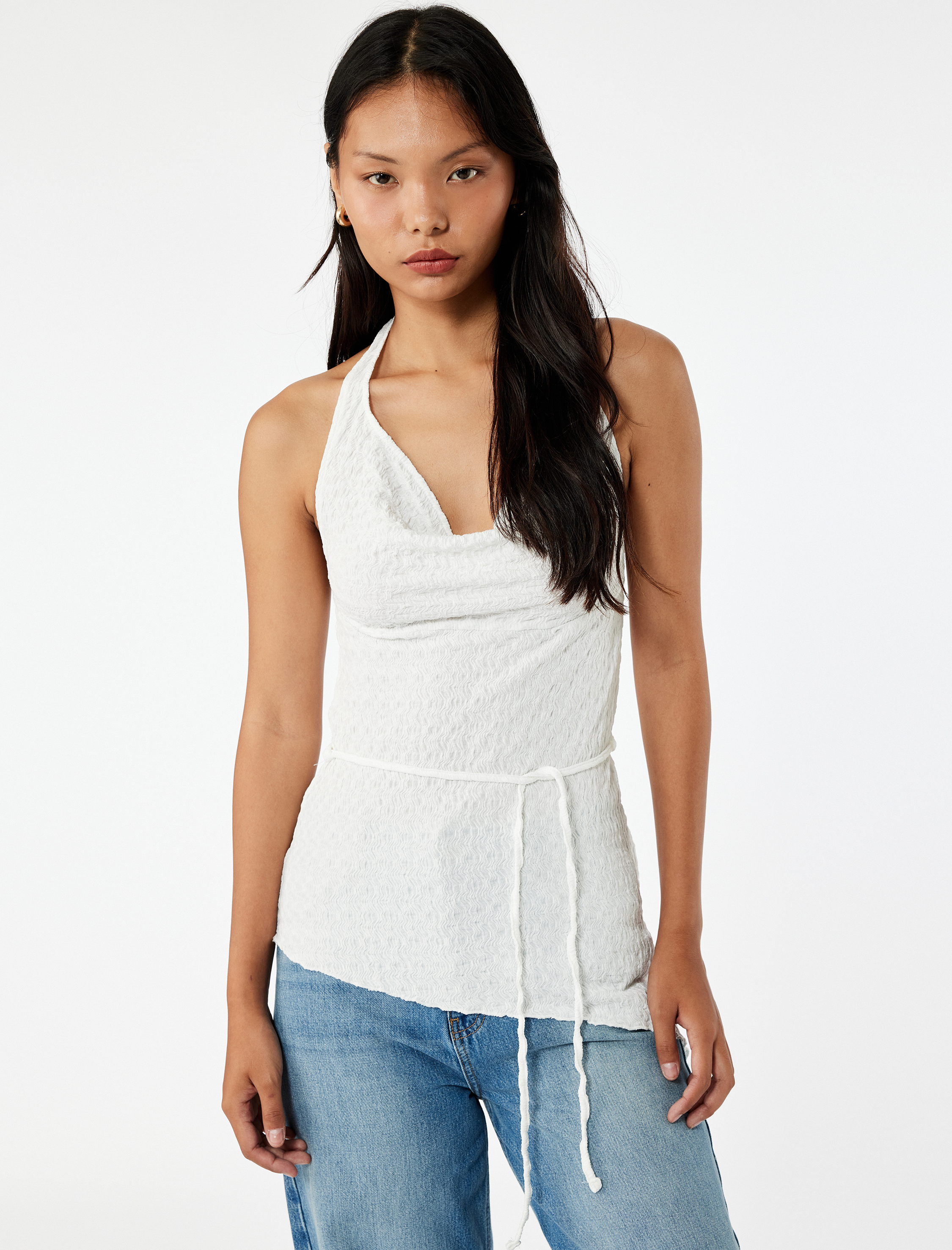 Bağlama Detaylı Slim Fit Bürümcük Asimetrik Kesim Kolsuz Degaje Yaka Bluz