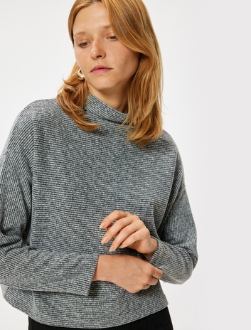 Uzun Kollu Fitilli Basic Dik Yaka Kısa Triko Kazak