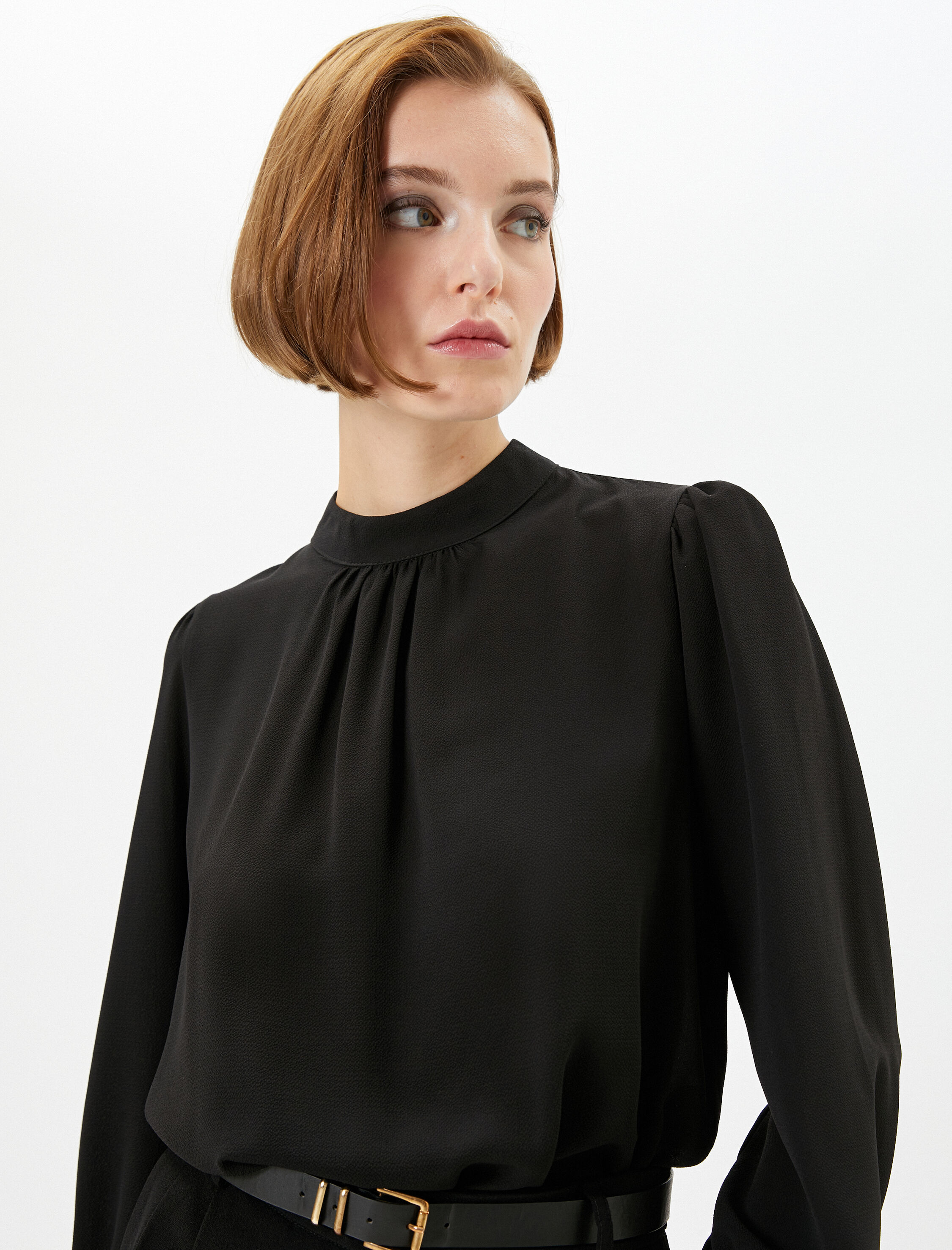 Günlük giyimde, ofis kombinlerinde ya da şık davetlerde, drapeli, dik yaka, balon kollu bluzu kombinlerinize dahil edin!