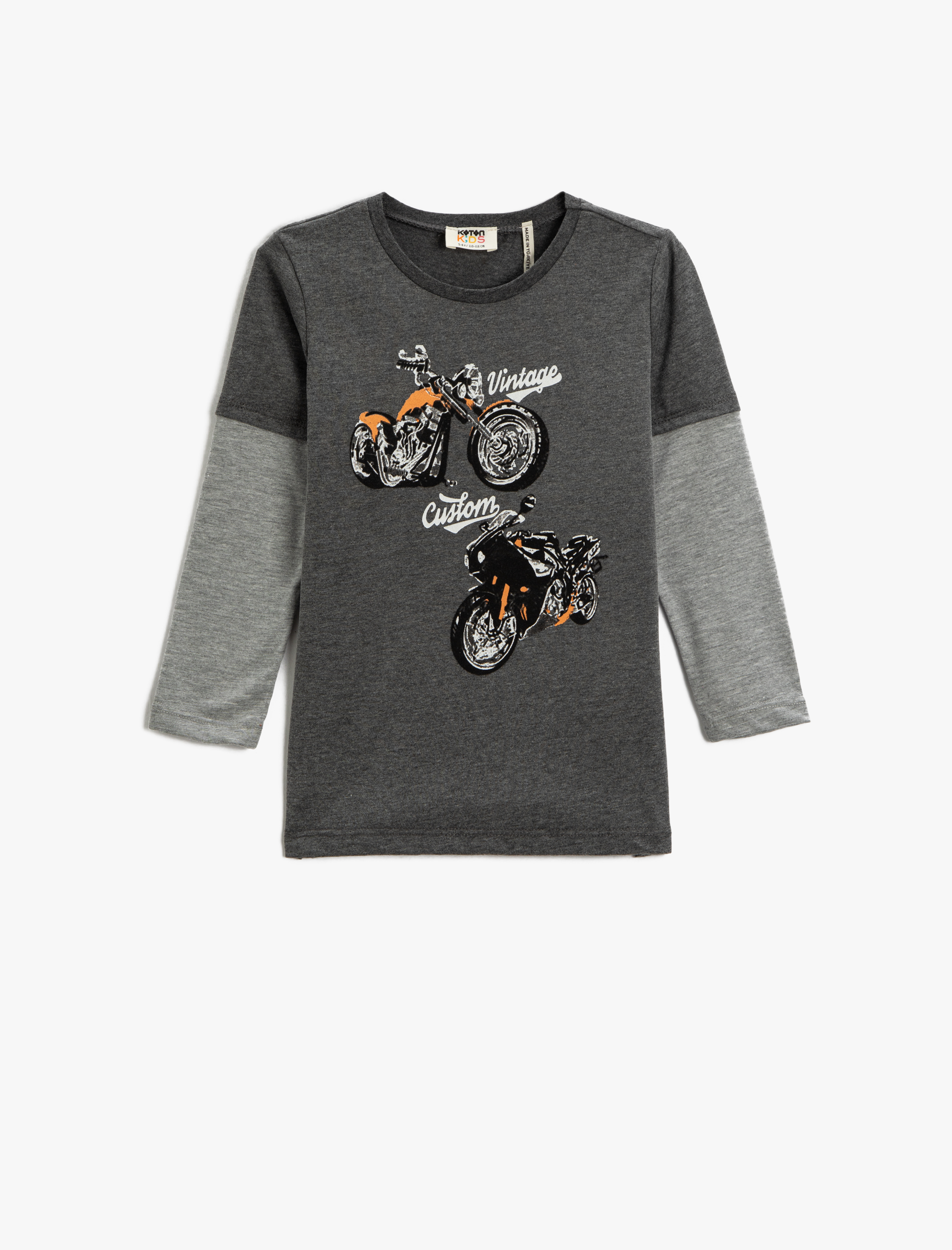 Motosiklet temalı, baskılı, bisiklet yaka, uzun kollu tişört.