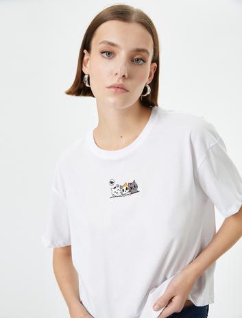 Kedi Nakışlı Tişört Kısa Kollu Bisiklet Yaka Pamuklu Standart Kesim Sepete Ekle