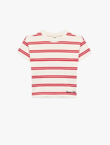 Pamuklu Kısa Kollu Bisiklet Yaka Baskı Detaylı Çizgili Oversize Tişört Sepete Ekle