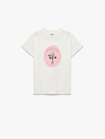 Çiçek İşlemeli Pamuklu Bisiklet Yaka Kısa Kollu Tişört Sepete Ekle