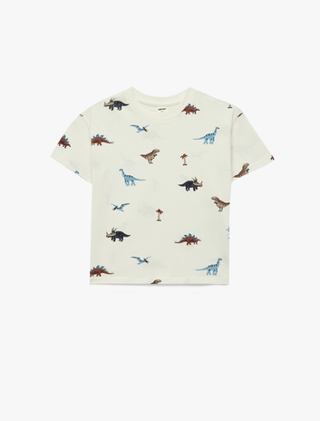 Pamuklu Bisiklet Yaka Kısa Kollu Dinozor Baskılı Tişört Sepete Ekle