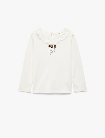 Pamuklu Fırfır Detaylı Çiçek Baskılı Bisiklet Yaka Uzun Kollu Tişört Sepete Ekle