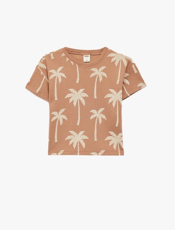 Palmiye Baskılı Kısa Kollu Bisiklet Yaka Pamuklu Tişört Sepete Ekle