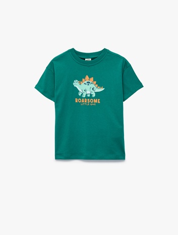 Pamuklu Kısa Kollu Bisiklet Yaka Dinozor Baskılı Tişört Sepete Ekle
