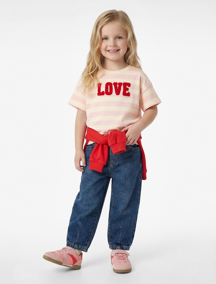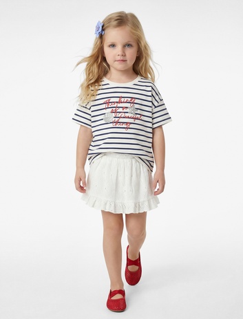Kız Bebek Pamuklu Kısa Kollu Bisiklet Yaka Baskılı Çizgili Tişört
