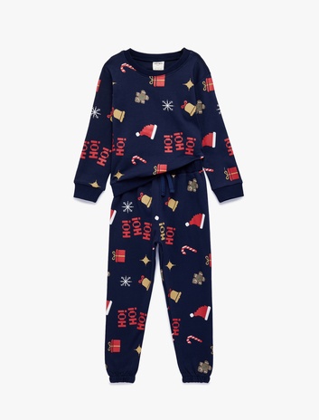Pamuklu Uzun Kollu Bisiklet Yaka Yılbaşı Desenli Pijama Takımı Sepete Ekle