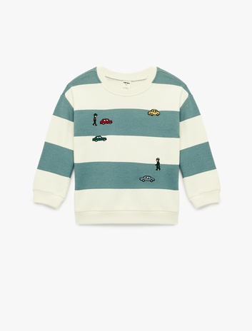 Uzun Kollu Bisiklet Yaka Nakışlı Pamuklu Çizgili Sweatshirt Sepete Ekle