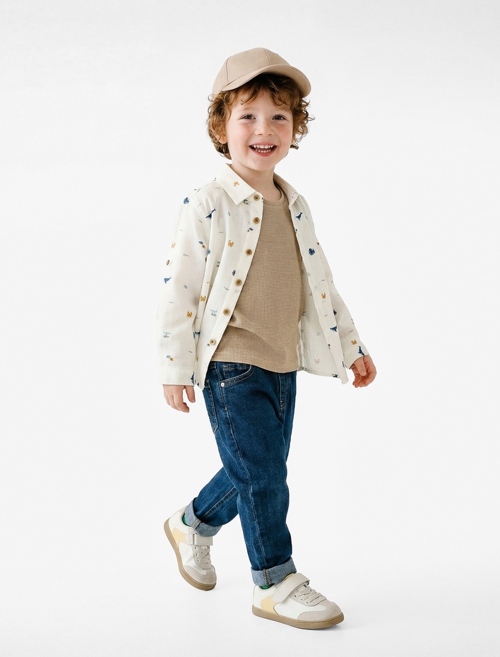 Erkek Bebek Pamuklu Uzun Kollu Düğme Detaylı Desenli Gömlek