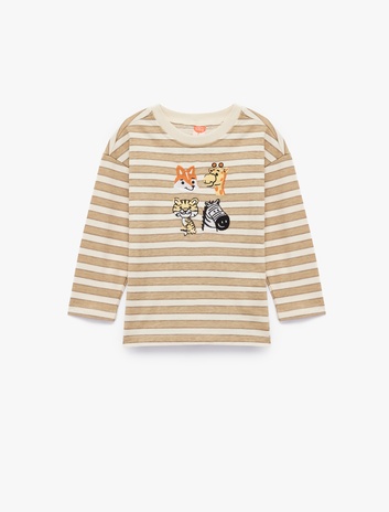 Pamuklu Uzun Kollu Bisiklet Yaka Nakış Detaylı Çizgili Tişört Sepete Ekle