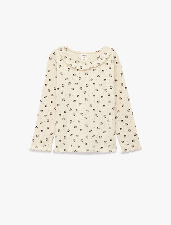 Pamuklu Uzun Kollu Bisiklet Yaka Fırfır Detaylı Çiçekli Tişört Sepete Ekle