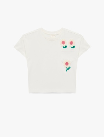 Kısa Kollu Bisiklet Yaka Çiçek Aplikeli Pamuklu Tişört Sepete Ekle