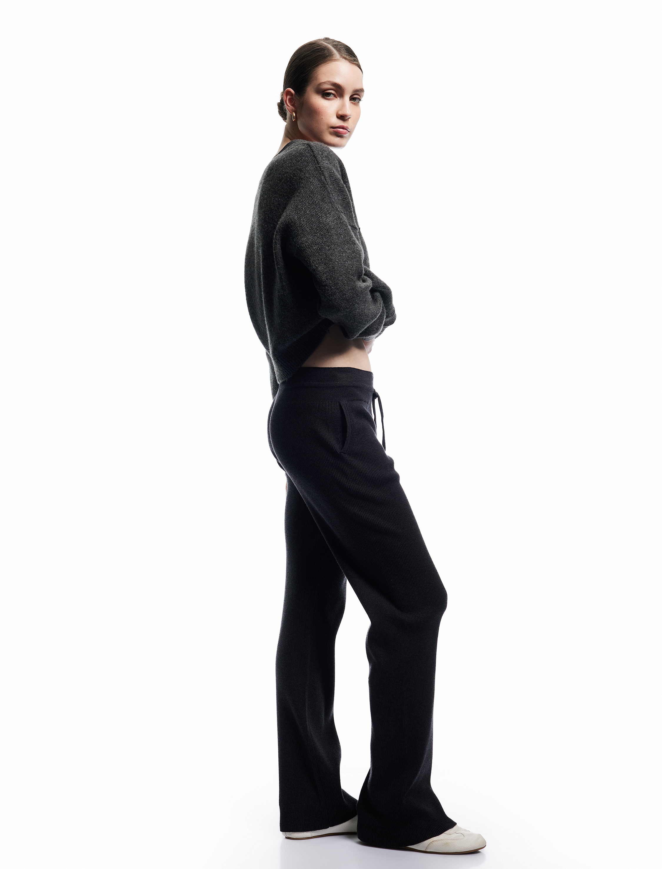 Beli Bağcıklı Cepli Yüksek Bel Düz Bol Paça Triko Pantolon