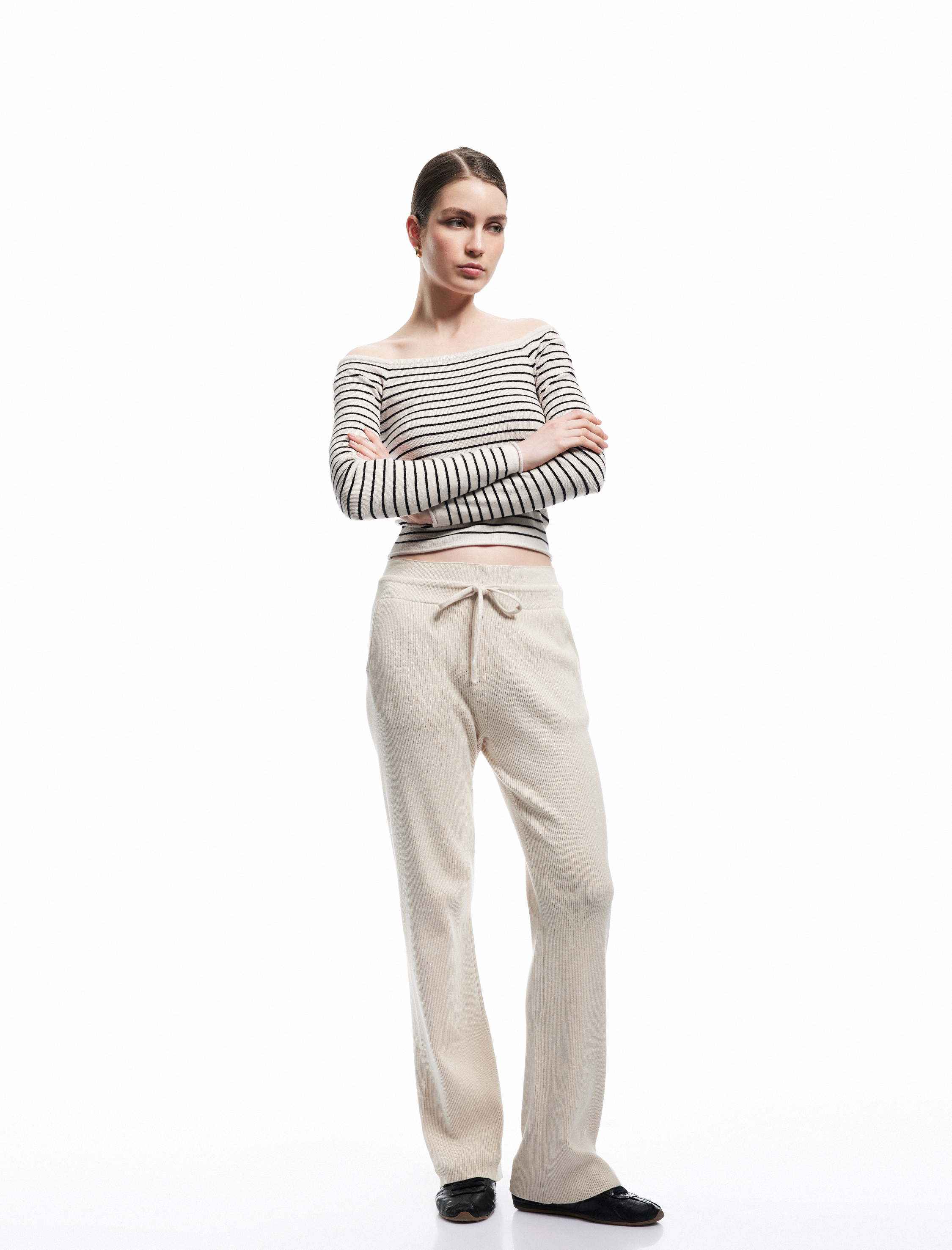 Beli Bağcıklı Cepli Yüksek Bel Düz Bol Paça Triko Pantolon