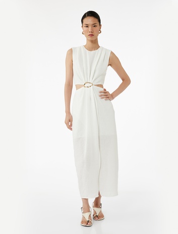 Aksesuar Detaylı Drapeli Kolsuz Bisiklet Yaka Midi Elbise