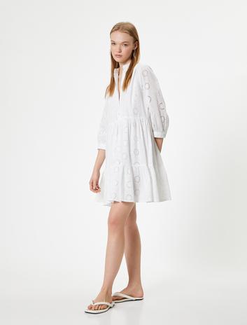 Mini Gömlek Elbise Pencere Detaylı Düğmeli Kısa Kollu Pamuklu