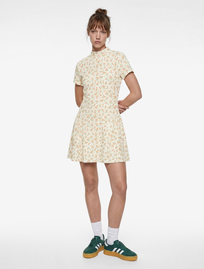 Mini Kısa Kollu Dik Yaka Çiçekli Kloş Elbise