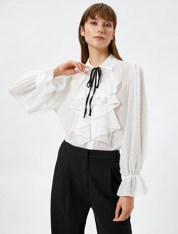 Şifon Gömlek Fular Yaka Fırfırlı Balon Kollu