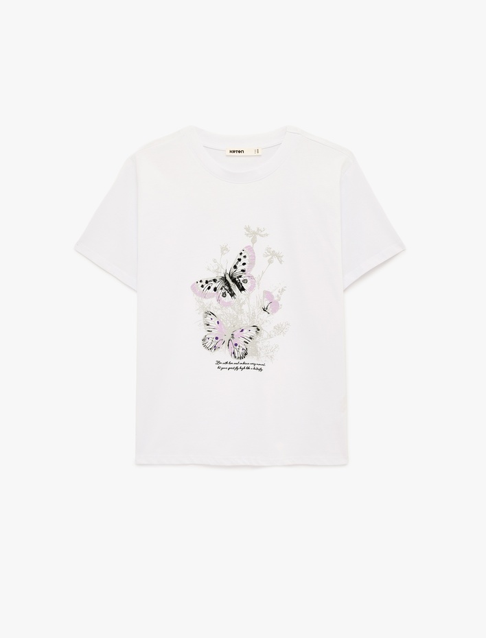 Pamuklu Kısa Kollu Bisiklet Yaka Kelebek Baskılı Tişört Sepete Ekle