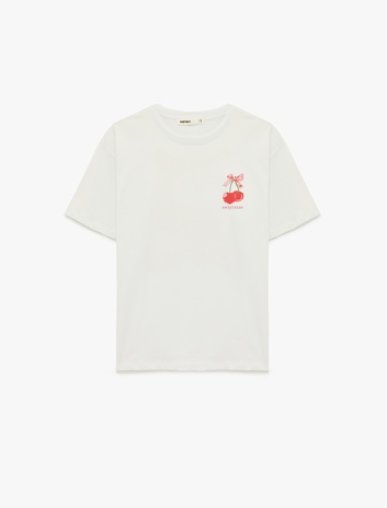 Pamuklu Kısa Kollu Bisiklet Yaka Arkası Kiraz Baskılı Tişört Sepete Ekle