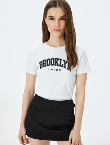 Bisiklet Yaka Kısa Kollu Baskılı Simli Baskılı Tişört